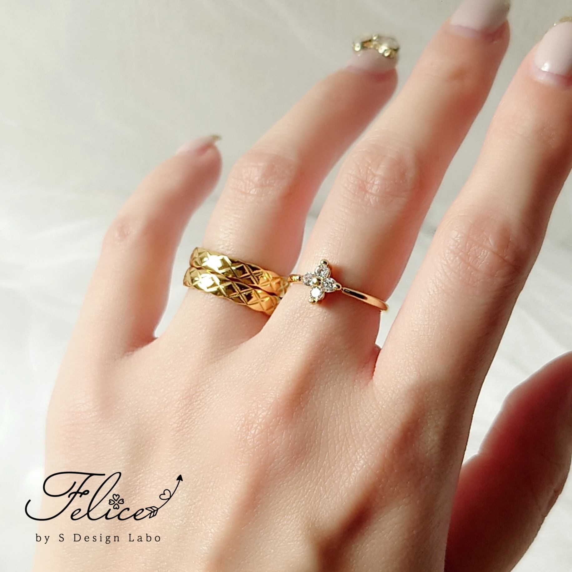 立体感のあるキルティング模様が輝きを放つ、幅4mmのステンレス製ゴールドリング。