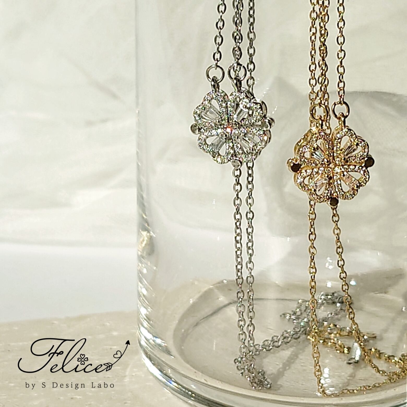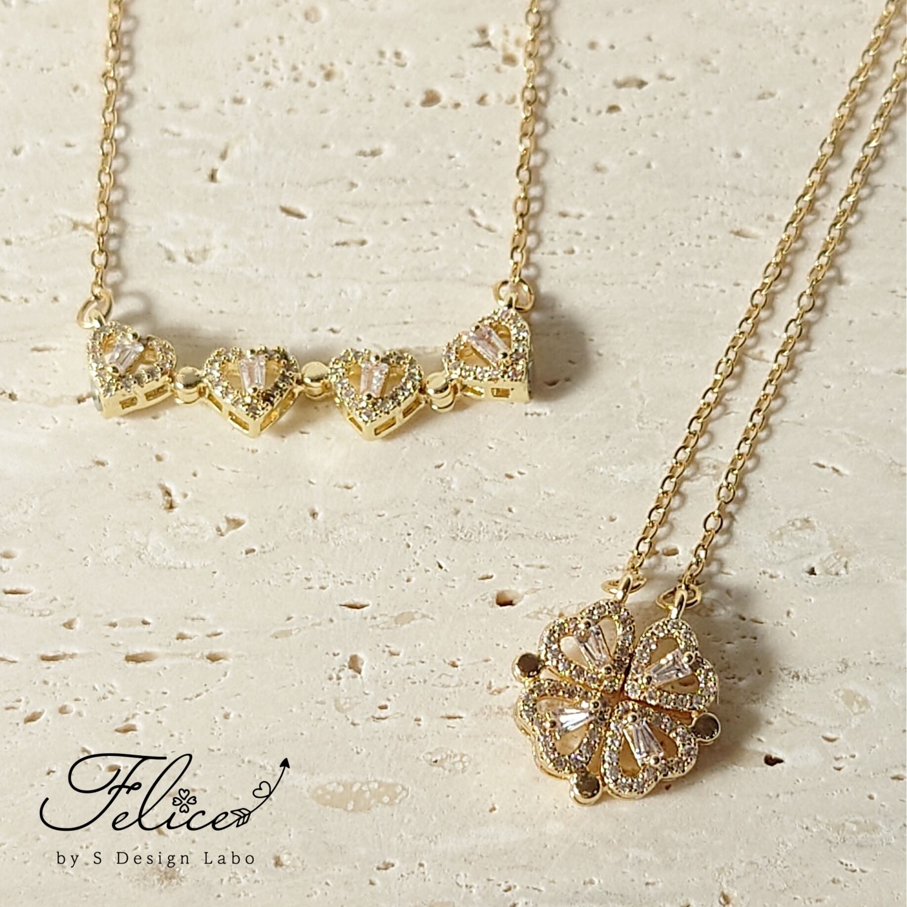 clover heart 2way necklace【 幸運のクローバー & ハート ネックレス 】ジルコニア ステンレス 2wayネックレス ゴールド/シルバー マグネット付き 金属アレルギー対応