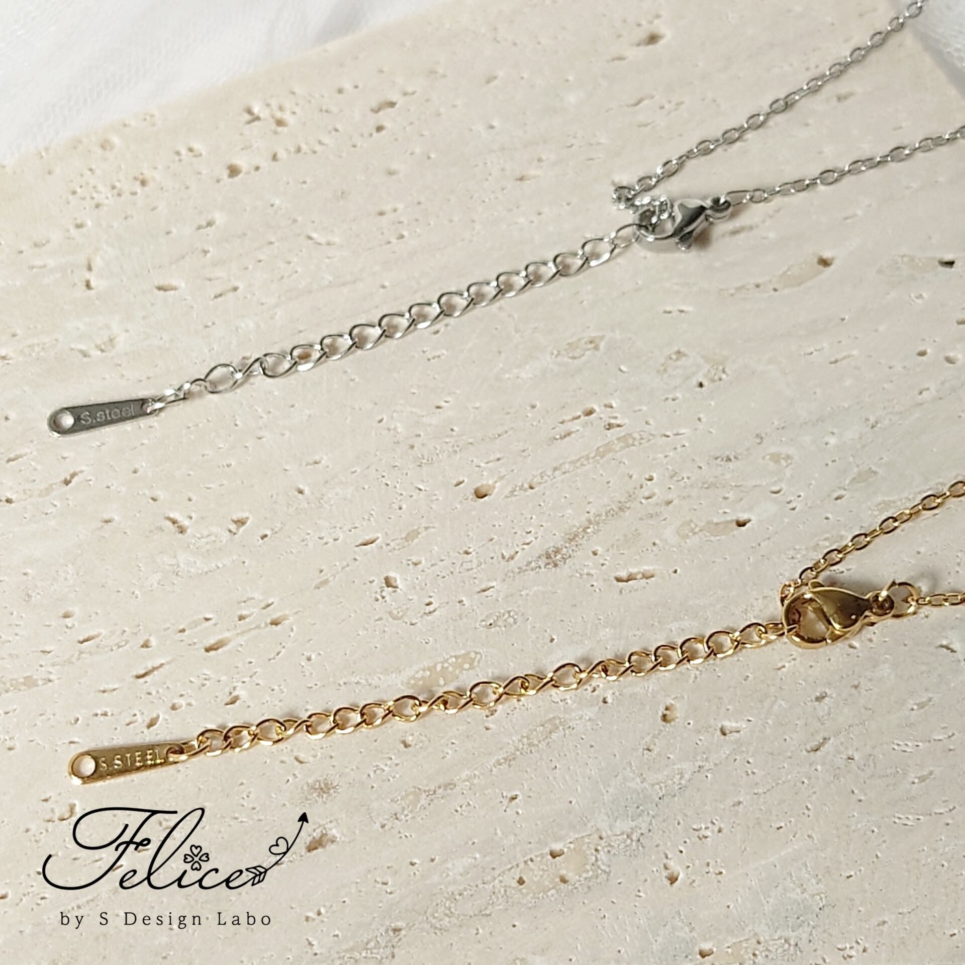 ステンレス素材は金属アレルギーに対応しており、水や汗にも強く、錆びにくく変色しにくいのでデイリー使いに最適。